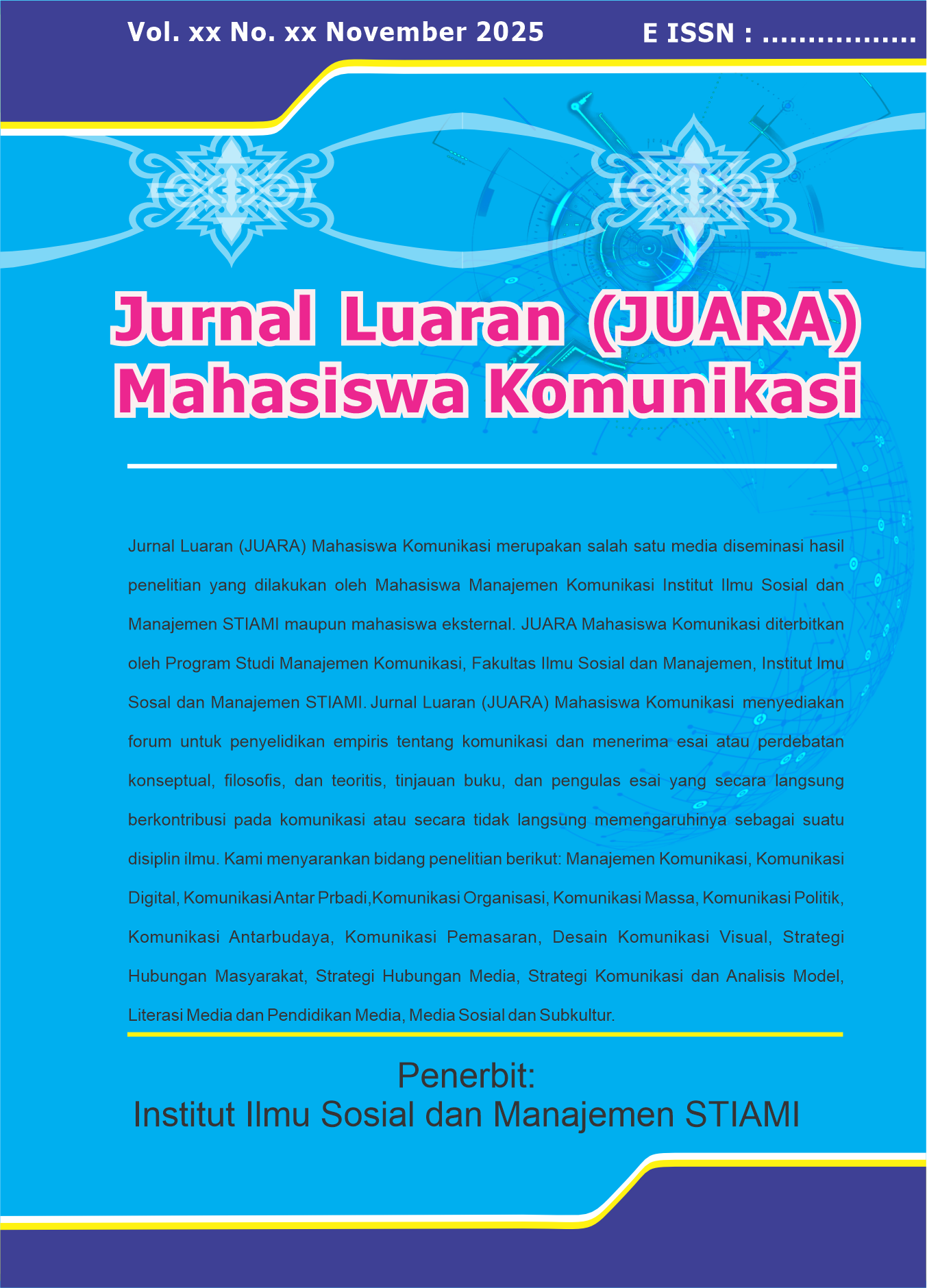 Jurnal Luaran (JUARA) Mahasiswa Komunikasi merupakan salah satu media diseminasi hasil penelitian yang dilakukan oleh Mahasiswa Manajemen Komunikasi Institut Ilmu Sosial dan Manajemen STIAMI maupun mahasiswa eksternal. JUARA Mahasiswa Komunikasi diterbitkan oleh Program Studi Manajemen Komunikasi, Fakultas Ilmu Sosial dan Manajemen, Institut lmu Sosal dan Manajemen STIAMI. Jurnal Luaran (JUARA) Mahasiswa Komunikasi menyediakan forum untuk penyelidikan empiris tentang komunikasi dan menerima esai atau perdebatan konseptual, filosofis, dan teoritis, tinjauan buku, dan pengulas esai yang secara langsung berkontribusi pada komunikasi atau secara tidak langsung memengaruhinya sebagai suatu disiplin ilmu. Kami menyarankan bidang penelitian berikut: Manajemen Komunikasi, Komunikasi Digital, Komunikasi Antar Prbadi,Komunikasi Organisasi, Komunikasi Massa, Komunikasi Politik, Komunikasi Antarbudaya, Komunikasi Pemasaran, Desain Komunikasi Visual, Strategi Hubungan Masyarakat, Strategi Hubungan Media, Strategi Komunikasi dan Analisis Model, Literasi Media dan Pendidikan Media, Media Sosial dan Subkultur.