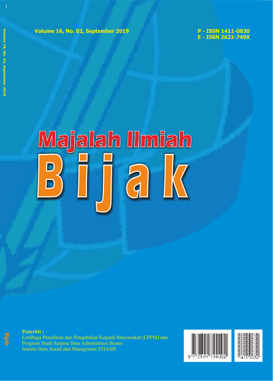 Majalah Ilmiah Bijak is a scientific journal of Administrative Science Business, published by Institut Ilmu Sosial dan Manajemen STIAMI / STIAMI Institute. The Journal of Business Administration is published 2 (two) times a year, every March and September, which contains the results of the study of Business Administration Studies. This journal aims to disseminate the results of thought and scientific analysis in the field of Business Administration Sciences.