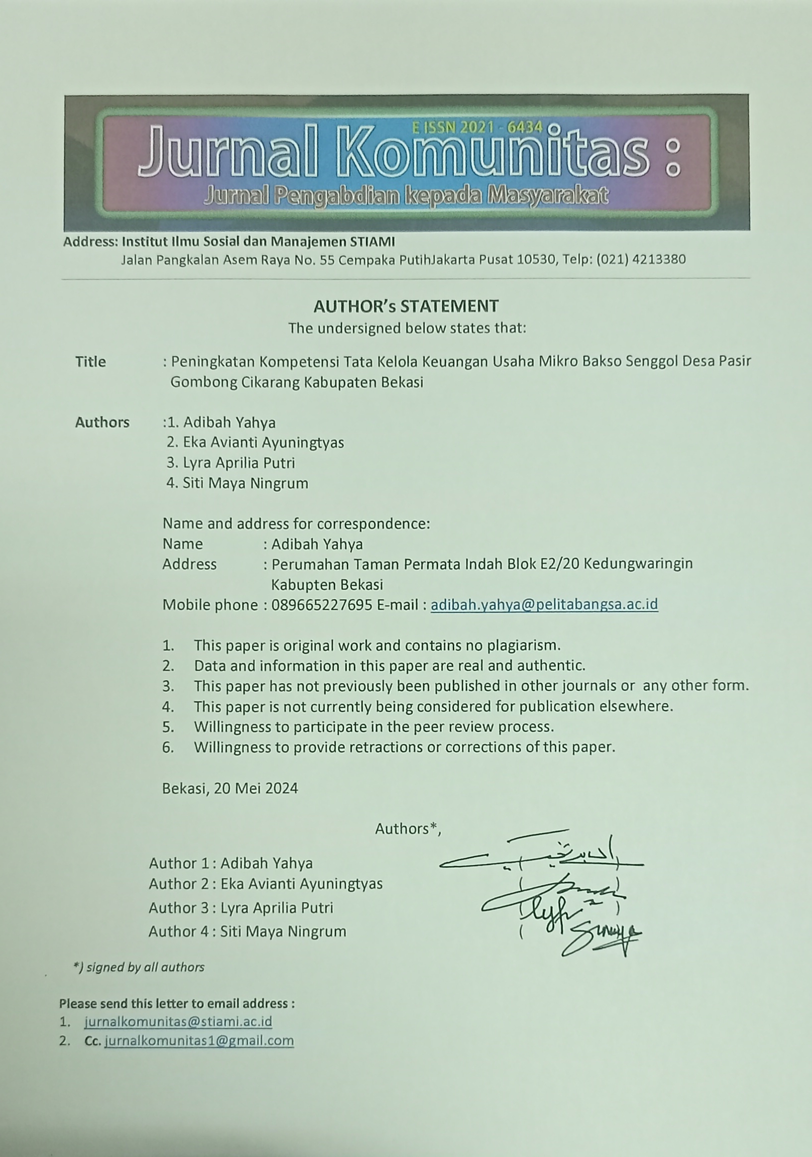 If the article was jointly prepared by more than one author, any authors submitting the manuscript warrants that he/she has been authorized by all co-authors to be agreed on this copyright and license notice (agreement) on their behalf, and agrees to inform his/her co-authors of the terms of this policy. Jurnal Komunitas : Jurnal Pengabdian kepada Masyarakat will not be held liable for anything that may arise due to the author(s) internal dispute. Jurnal Komunitas : Jurnal Pengabdian kepada Masyarakat will only communicate with the corresponding author.